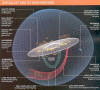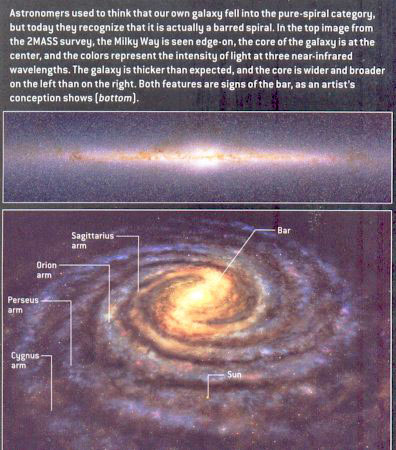 The solar system is trundling around at nearly 200 km/sec in the Local or Orion Arm - a spur in between the more substantial Sagittarius and Perseus arms. The Milky Way is now known as a barred spiral. The evidence, at first indirect, began to accumulate in 1975: stars and gas tracked in the middle of the Milky Way did not follow the orbits they would if the spiral pattern reached all the way in. Recent surveys of the sky in near-infrared light have revealed the bar directly and dispelled the remaining doubts (Figure 05-16b)