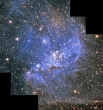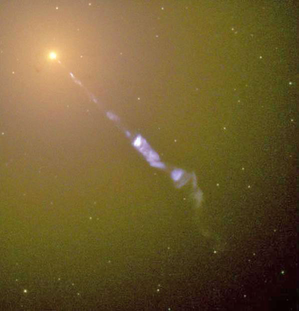 the Virgo supercluster (see Figure 03-06). It is centered on the Virgo cluster and extends some 150 million ly across. The Virgo cluster itself contains thousands of galaxies including M87 (right), which is known to surround a gigantic black hole. Virgo's gravity affects the movement of its neighbors, including the Local Group. (below right)