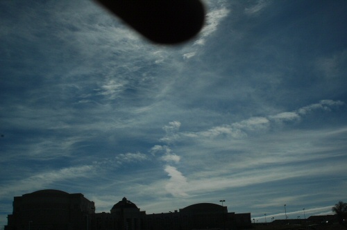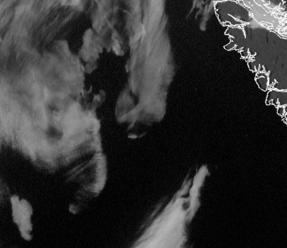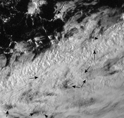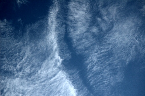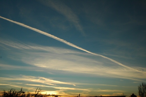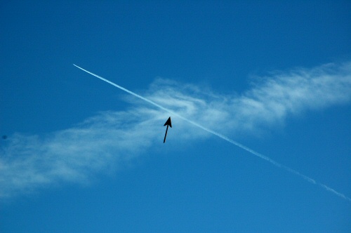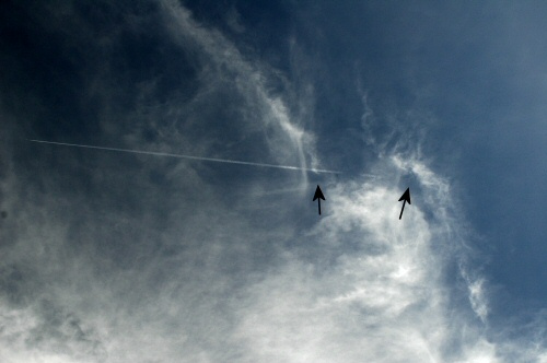 Notice where the brightening of the particles of the trail has occurred, and where the trail is in relationship to the darkened area bisected by the cirrus wisp running vertically through the center of the image.