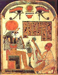 Facts About Atum (RA), Osiris and Isis Prehistoric Egyptians held the premise that the oceans preceded and in some way contributed to the creation of the living cosmos. From the Fifth Dynasty Pyramid Texts, the Heliopolitan theory of creation states that Atum (the sun god Ra) independently created himself from a singular expression of self will—an act visualized by the Egyptians as a divine egg that appeared upon the primordial waters of the all-filling ocean called Nun, out of which Atum (meaning He who created himself), emerged. Egyptians described Ra as navigating the heavens in a flying "boat." Horus was a descendant of Ra and flew through the heavens on a winged disk as well, which "shined with many colors." A hieroglyphic in the temple at Edfu describes one such event: