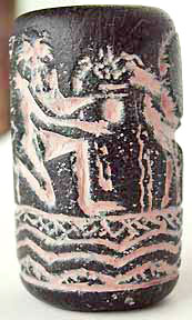 A magnificent large cylinder in a heavy black stone, deeply incised and heavily modeled as on typical Akkadian seals. It shows Utu-Shamash watering the animals of Dilmun under the orders of Enki, the water spouting in two streams from the sacred pot in his hands.