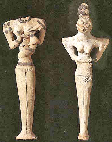 The figure on the left holds a baby on her hip and suckles it. The figure on the right has incised stretch marks on her abdomen. It has been suggested that the brown-painted dots and lines represent tatoos, and the clay pellets scarring. It is unknown if the shape of the skulls represents actual head-binding. Similar Lizard-headed figurines have been found at Eridu.