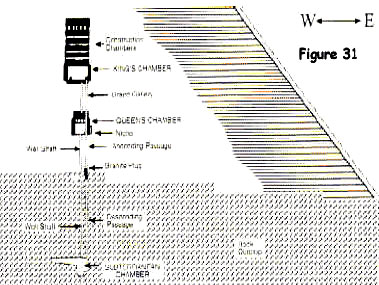 But, instead of dismissing the possibility, T decided to revisit the evidence. I was immediately struck by something so obvious that it is habitually overlooked. In one corner of the King’s Chamber is an excavation in the floor which is attributed to Caliph Al Mamoon in AD 820. A mutilated lump of granite from this excavation still remains in the chamber, whilst the hole in the floor is covered with a metal grille, as can be seen in Plate 31. This hole lies near the north-west corner of the King’s Chamber the exact location for a connection with the kinky shaft!.