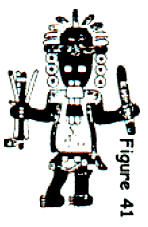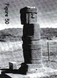 There are also some similarities between the statues of Easter Island and those of Tiwanaku. Figure 50 shows the statue of Pachacamac situated within the Kalasasaya; its 2-tier hat can still be discerned despite the attempt to vandalize it, and it bears some resemblance to the two-tier hats of the moai (Plate 54).
