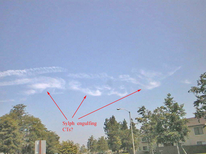 After a seven week absence of observable chemtrails in the Irvine area of Orange County, California, I was dismayed to see a new chemtrail spraying assault initiated on the morning of June 25, 2004. Actually, I was alerted to go outside that morning because I had received a phone call from a friend who was driving on a nearby freeway. He called me from his cell phone to tell me that he was looking at what he described as a ’dolphin shaped’ Sylph "eating" a chemtrail to the west. I had only recently told him about the Flying Crane Sylph that I photographed on June 12 and how the influx of Sylphs into this area seemed to have cleared the skies of chemtrails and its attendant smog (and gloomy feeling) for the past two or three months. I might also mention that it’s been lightly breezy here almost everyday for at least two months. Before that, it was NEVER breezy in this area. The reappearance of dark blue skies, lightly gusting winds, and the feeling of a clean and wholesome atmospheric environment where you hear birds singing and kids frolicking around on the grass are clear signs of a positive "OR" enriched atmospheric orgone environment.