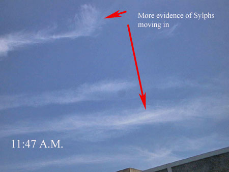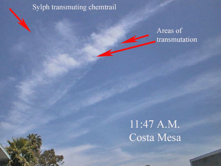 Today, though, Sylphs can be seen by the casual observer. You just have to look up in the sky wherever you see chemtrails being sprayed! They assume the appearance of very unique cloud shapes that will not be found within the pages of any cloud atlas found at any university offering diplomas in meteorology. If you study the photos of Sylphs posted at this and other web sites, you will soon be able to quickly distinguish between a Sylph, ’real’ clouds, and chemtrails. In time, you should be able to even recognize the slight difference in appearance between transmuted cloud banks and ordinary clouds.