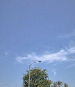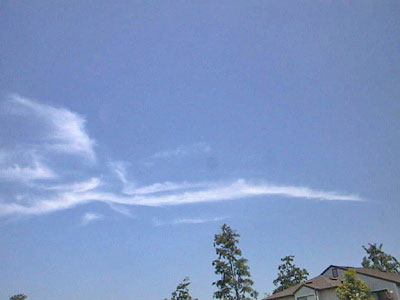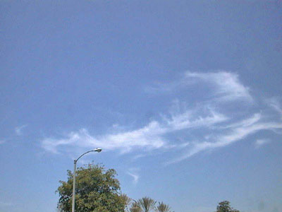 "When the influx of Sylphs began a few months ago, DB contacted me by e-mail and wanted me to put him in contact with ZS Livingstone, as the Sylphs were telepathically telling DB that he should recognize ZSL's special relationship with them. We did so and soon afterwards, DB began posting pictures of Sylphs almost daily at his web site. Another fellow in Canada also started a web site devoted to chronicling the heavenly activities of these dedicated chemtrail munching workers (A unexpected event just took place here. As I was typing these words on the morning of June 12, 2004, I had to go to a local shopping plaza to pick up something and after parking the car, I was pleasantly surprised to see the biggest Sylph I've yet to see with my own eyes. It stood out alone, in an otherwise totally clear, blue sky. It was so big, I had to pan the camera and take two shots to get the whole image of the Sylph. I mentally said hello to him and thanked him for putting on such a grand show in our little town on such a bright, breezy, and sunny morning)."