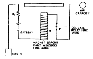 The magnet M is to have a resistance nearly equal to the internal resistance of the battery, so as to get best output. The relay will suit as it is with 1000 ohms resistance. The magnet must be strong to blow out tube when lighted. This device should by very sensitive and should break down by very minute currents propagated through the earth from a similarly connected oscillator.