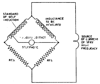 A standard of self-induction is provided with a sliding contact so that any number of turns can be inserted. Two resistances, suitable for the source of high frequency current and the inductance to be measured, are connected in the manner of a bridge. The two opposite points, one movable, are connected through a telephone. When no sound is heard then we have the two inductances that is, the one to be measured, and that part of the standard which corresponds to equilibrium or silence in the telephone-practically equal if the quantities are suitably chosen.