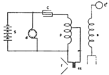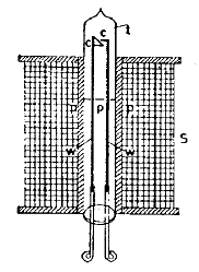 In a small glass tube / are fixed two thin wires w w of soft iron or steel carrying contact points of platinum c c on the top. A spool S wound with wire surrounds tube. The contact points are shaped so that the wires can deviate considerably without the separation becoming too great. When the current passes through coil S the wires w w are separated and the distance between the contact points, c c increased. The tube is moderately exhausted.