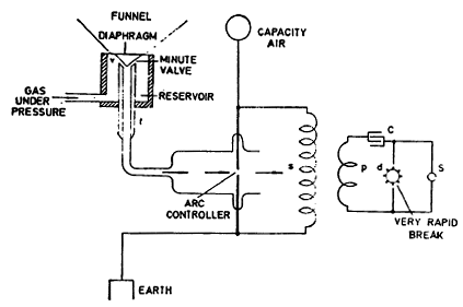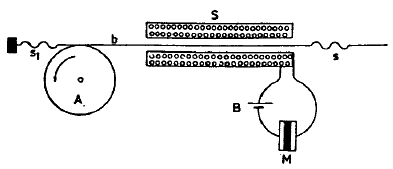 The control of the arc is effected by a jet of air or other gas issuing under pressure from an orifice the opening of which is controlled in some convenient way by the vibrations. An arrangement of such apparatus is illustrated in the diagram below, the arc controlled thus being in the secondary. The source of direct currents S charges a condenser C and the discharges of the same (a very great number) through a break d and primary p energize a secondary s with the usual connection in telegraphy as I have introduced.
