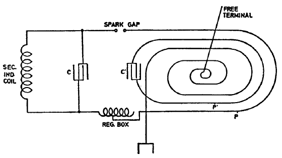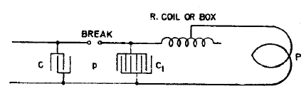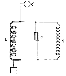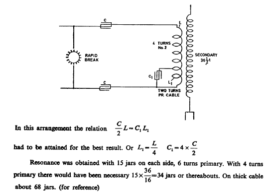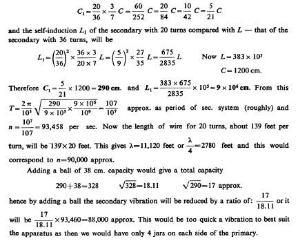 Experiments with oscillator secondary 36 1 /2 turns were continued. Many modified arrangements with auxiliary condensers one of which is illustrated in the sketch below were tried. All these chiefly aimed at prolonging the vibrations in the primary after each break and also at effecting sharper tuning of the circuits.
