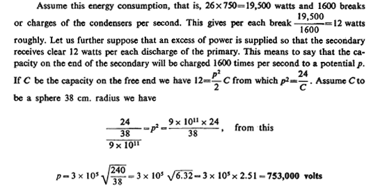 So through just a bulb of highly rarefied gas an immense amount of energy may be passed and currents of a maximum strength such that they can not traverse a copper wire, owing to its resistance and impedance, may be made to traverse the rarefied gas.