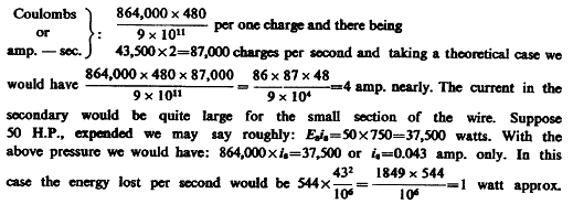 To get a rough idea of how the coil might work suppose that on the primary there would be 40,000 volts and that there were 36 turns of secondary, then there would be theoretically an e.m.f. on the terminals of secondary 40,000x36=1,440,000 volts and, deducting with reference to mutual inductance 40%, we would have 1,444,000x0.6= 864,000 volts impressed or induced e.m.f.