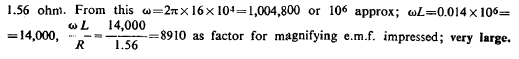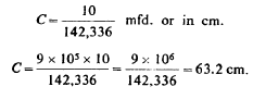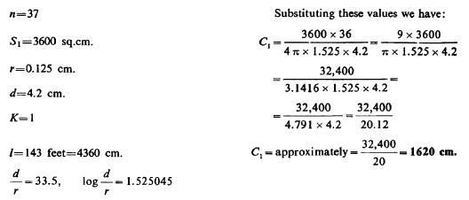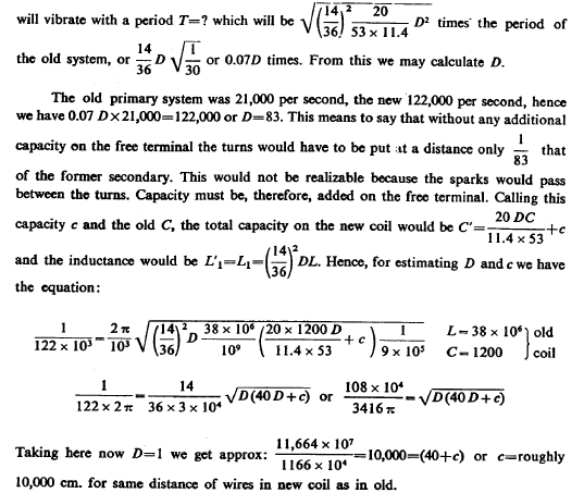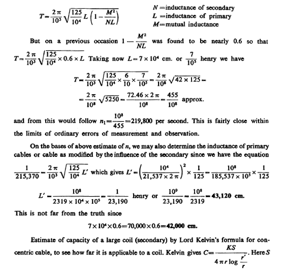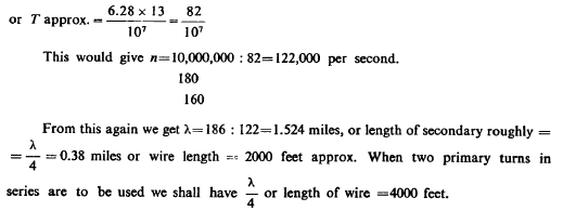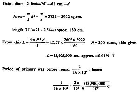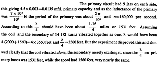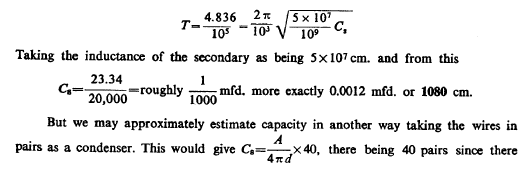 From this T=4.836 1/105 as calculated. This gives n=1/T=20,700 per sec. approx. With this vibration λ was nearly 9 miles or λ/4=2.25 miles. Actually, there was only one mile of secondary wire but owing to the large capacity (distributed) in the secondary the vibration was much slower than should be inferred from the length of wire. We may estimate the ideal capacity, which associated with the inductance of the secondary would give a vibration of the above frequency. Since there was resonance we have: