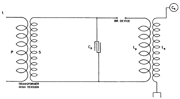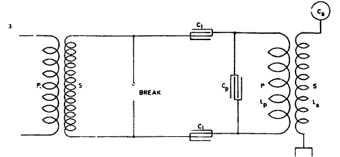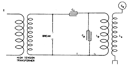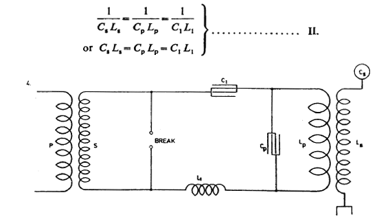 Fig. 3. illustrates an arrangement similar to that shown in Fig. 2. but with a condenser in each branch. The same considerations made in regard to Fig. 2. hold good for this and in both cases, if there is to be resonance and best conditions attained, the circuit including the break should have the same period and be in phase with primary circuit LpCp and secondary LSCS.