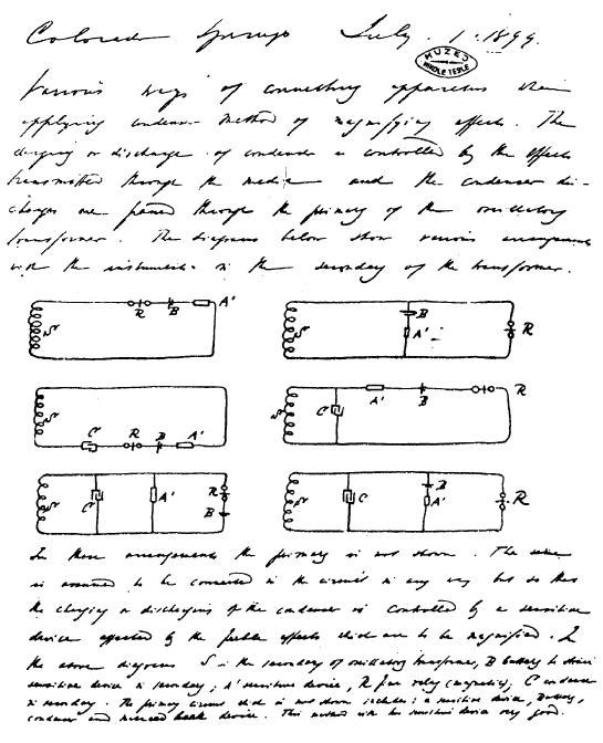 They also appeared frequently thicker on the bottom than on top. Can this be so? Perhaps it was only due to the fact that the portion close to the ground was nearer to the observer. The storm began to be perceptible at a distance as it grew dark and continuously increased. An instrument (rotating "coherer") was connected to ground and a plate above ground, as in my plan of telegraphy, and a condenser was used to magnify the effects transmitted through the ground.