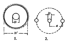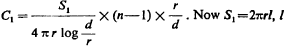 Here S is the surface of inner copper conductor, r' radius of inside hole of conductor outside of cable, r radius of copper conductor inside (Diag. 1.). Assuming now a cable wound up having n turns at a distance d, each turn may be considered as having a conductor on either side at distance d.