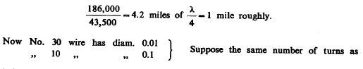 Neglecting the capacity of the coil this length should be =λ/4 or the quarter of a wave length. Of course, it was less but it was surmised that it would not be very much less. The total length of wave was then λ=4560 feet. From this would follow