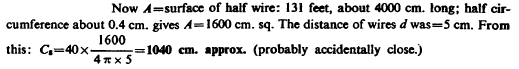 It was resolved to adopt 122,000 per second (see note before) in the primary as compared with 21,000 per second with the old secondary which was obtained with 15 jars on each side of the primary. For this vibration (122,000) the length of the new secondary should be about 2000 feet, this being the length of a quarter wave. Calling now the distance between the turns of the new coil d, its capacity as compared with that of old secondary of a length of 5280 feet would be: