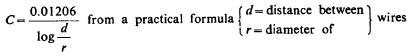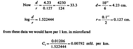 This gives C in microfarad per 1 km., according to the authority. Here the length of wire total is 5280 feet roughly or 5280 X 12x2.54=-160,934 cm. Taken as a pair of conductors this would give length 160,934/2=80,467 cm.