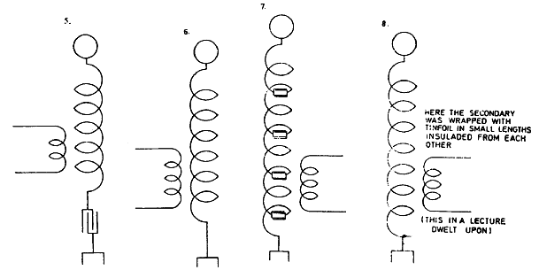 An idea was already obtained beforehand as to the frequency which was likely to be found but more wire was wound on the coil to enable the adjustment to be effected by taking off turns. Turns were then taken from the lower end of the coil until a maximum of spark length from free terminal was obtained. The coil then gave a spark 5" long. This took place when there were 1140 feet of wire on the coil, this length being found by measurement of resistance