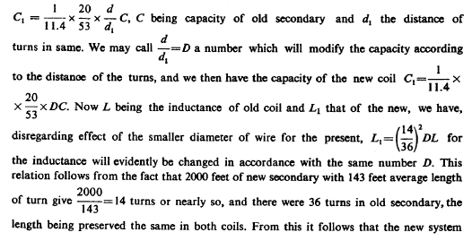 The diameter of this wire was only 1/11.4 of that of wire or cord No. 10 hence the capacity of the new secondary, assuming all other things to remain the same, would be only 1/11.4 of the capacity of the old secondary. The capacity of the new coil would be, however, reduced or increased in proportion to the length of the new wire relatively to the old and would be furthermore regulated by the distance of the turns.