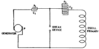 Such an arrangement with two condensers has certain valuable features in connection with oscillators, particularly when they are worked from a generator-of very high and constant e.m.f. The condenser included in the generator circuit prevents short circuiting of the generator in case of defective action of the make and break device and the amount of energy drawn from the source is limited to a quantity which can be exactly determined beforehand. The arrangement is sometimes of value also with alternate current generators.