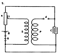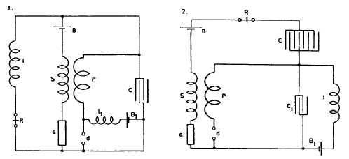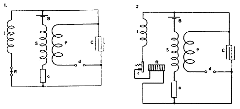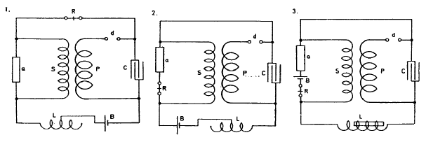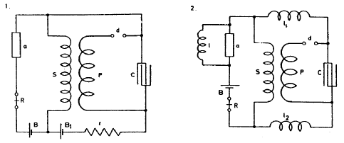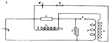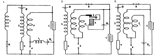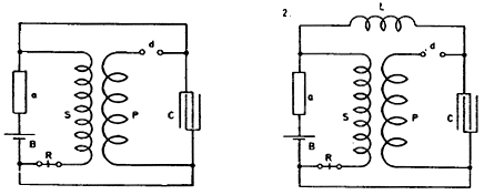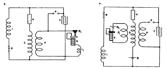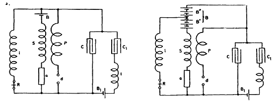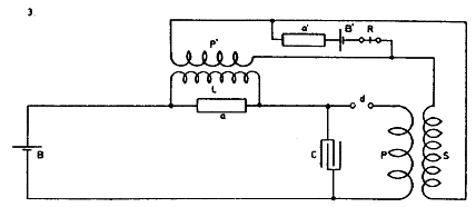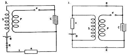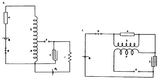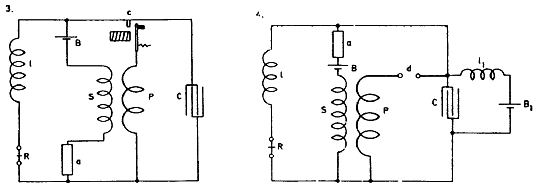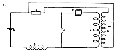 Fig. 2. illustrates a disposition similar to one experimented with before, only in series with buzzer b and auxiliary exciting battery B1 a primary which was adjustable (P1) was used. This arrangement was modified to the one illustrated in Diagram 3. The intention being to use the same break for both primaries P and P1.