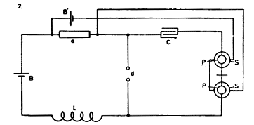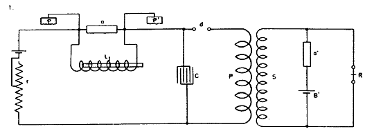As in some previous experiments the fine relay R was affected by the break d, the relay with an adjusted high ohmic or inductive resistance / was placed in a special branch circuit (1.)