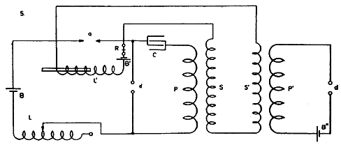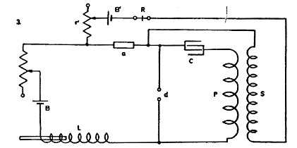 An independent sensitive relay is used and adjustable dead resistances r and r' in primary and secondary circuits. The inductance L is also made adjustable and so is also break device d though this is not indicated in the diagram.