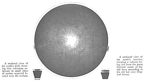 A sectional view of the earth's interior, showing a volcano being fed from the great internal ocean of liquid lava according to the old but very illogical theory. |