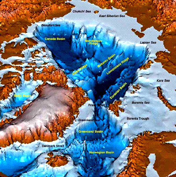 The drawing of the magnetic lines of force, in the second image above, corresponds very well to the deep trench which begins just North of the New Siberian Islands and stretches across the Arctic basin. The floor of this deep trench has not been mapped well, supposedly because of the buildup of so much organic matter on its bottom, i.e., crustacean shells, Mammoth tusks, et cetera, that sonar resonances are weak. Even so, this is the area where Dr. Fridtjof Nansen had his anomalous Arctic experiences and where the European, North American and Asian tectonic plates come together in a tri corner. For reasons such as these, hollow Earthers will arrive at their own conclusions about what actually exists along this trench in the Arctic basin.
