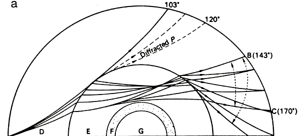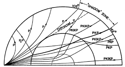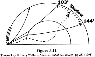 the other side of the Earth! The next problem in global seismology is explaining the mysterious "Shadow Zone". There is a lack of P waves between 103o-144o from the epicenter of a quake. Take a look at the problem as seen from a university-level text-book on seismology.