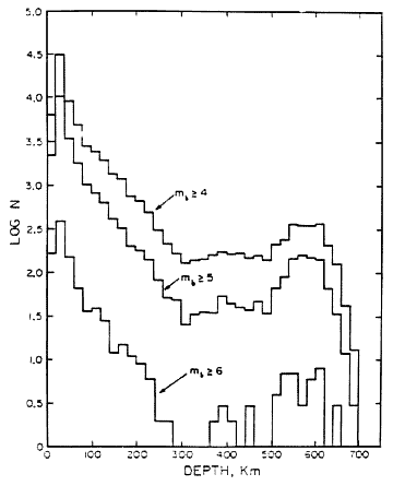 less quakes with depth (though they do not stop at 150 Km as expected). Then
