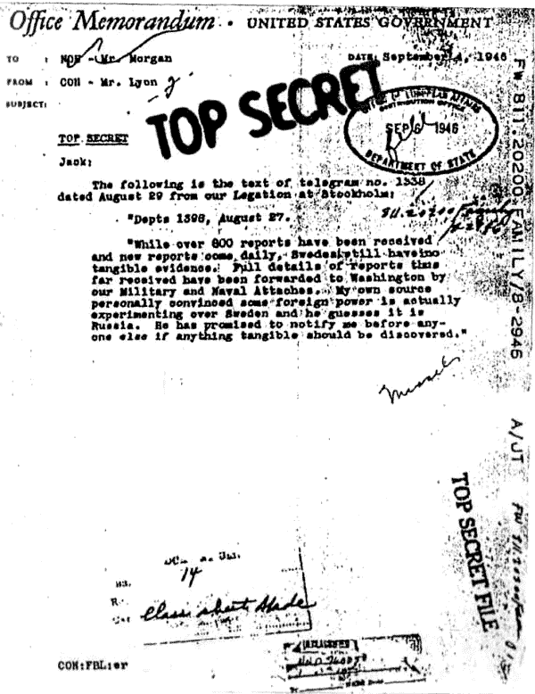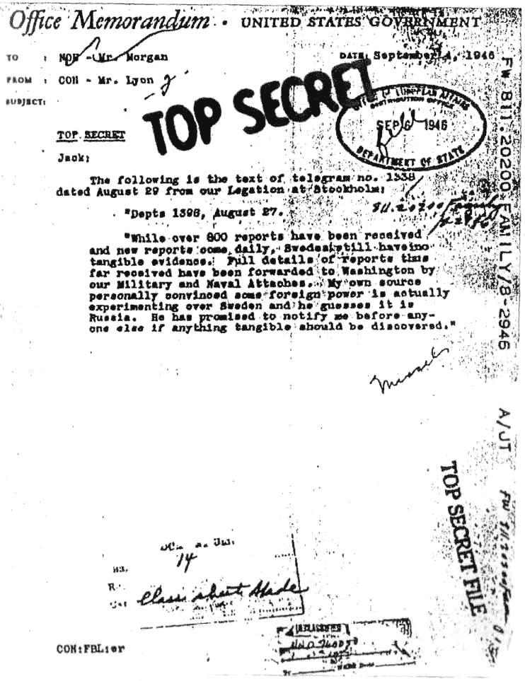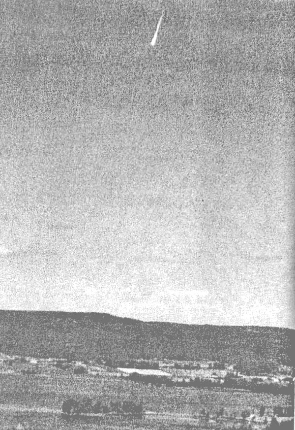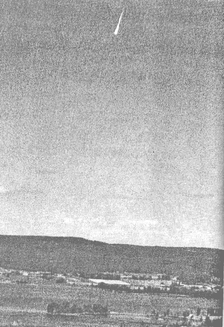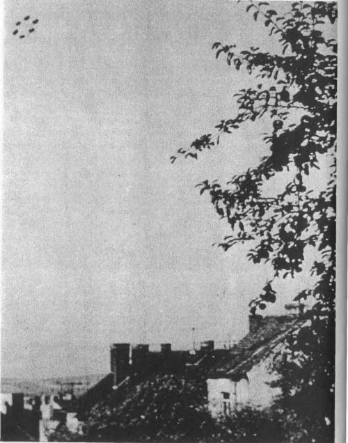 The above photo, showing six saucers in formation, was given to Dr. J. Allen Hynek in the early 1950s by the director of the Ondrejov Observatory in Czechoslovakia. No details of the sighting are available, but the photo is thought to have been taken near Prague, perhaps during WWII.