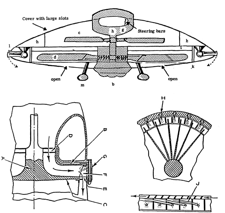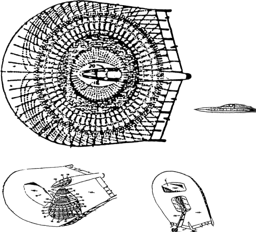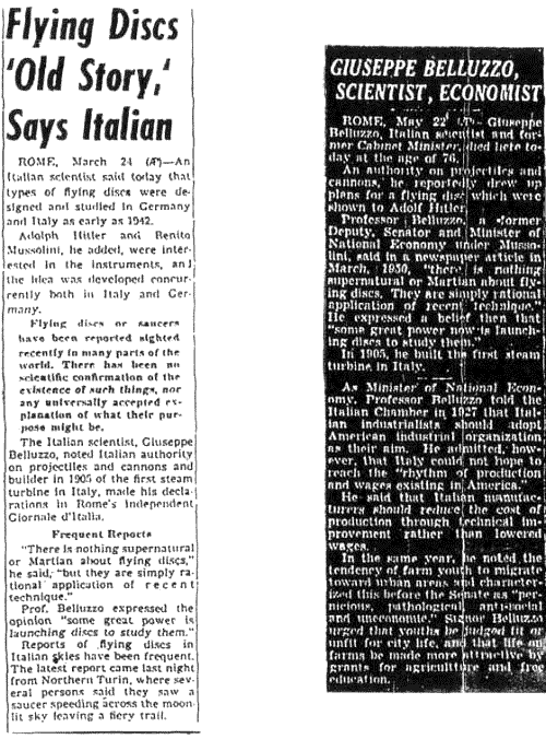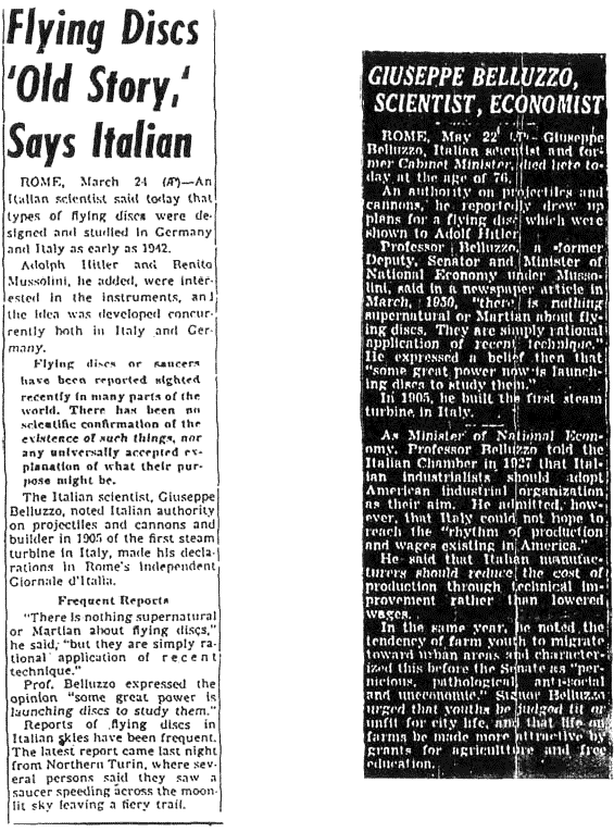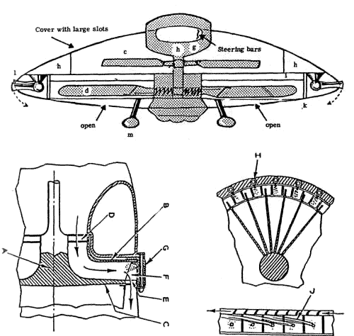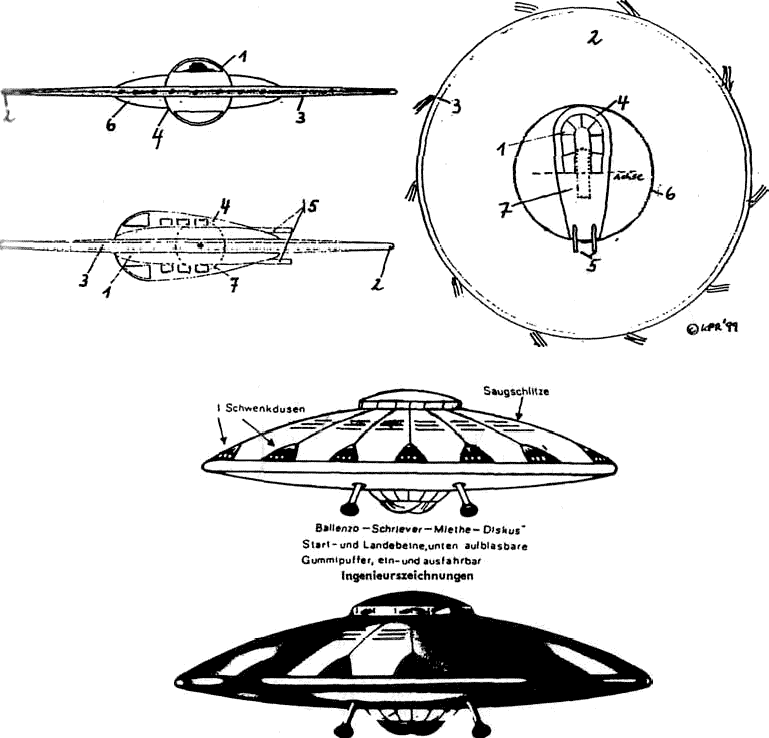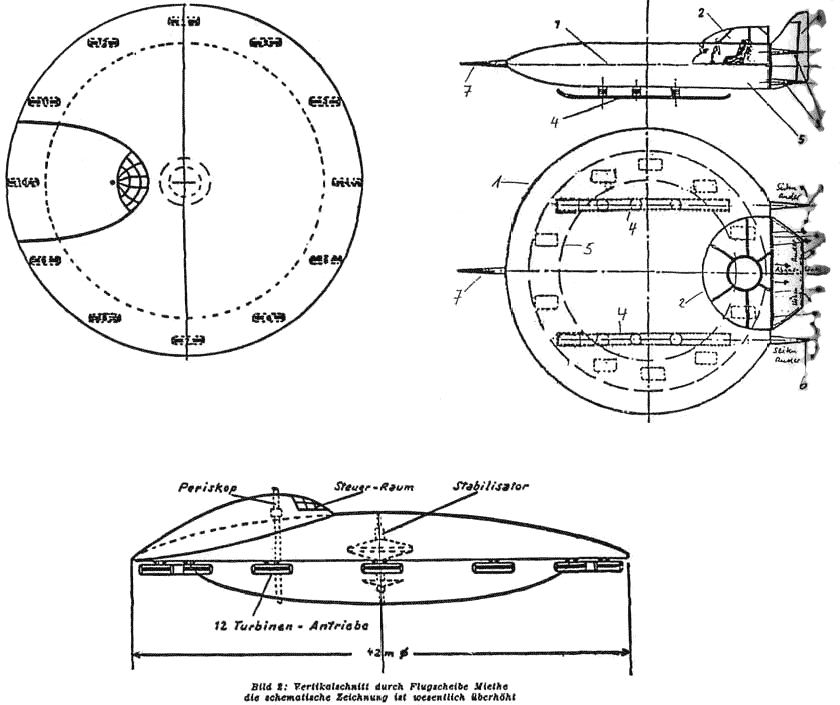 Giuseppe Belluzzo On the left, a column from The Mirror, dated March 24, 1950. This is one of the earliest English references toGerman flying discs. On the right is Dr. Belluzzo's obituary, dated May 22, 1952 from the New York Times whichagain mentions German flying discs. The designs envisioned by Dr. Miethe and Professor Belluzzo were quite different from those of Schriever and Habermohl. Designs of this project consisted of a discus-shaped craft whose outer periphery did not rotate. Two designs have positively been attributed to Miethe and Belluzzo although three designs exist as part of their legacy. The first design is made known to us from Georg Klein's article in the October 16, 1954 edition of the Swiss newspaper, Tages-Anzeiger fuer Stadt und Kanton Zuerich, mentioned above. The same design is reproduced in the book by J. Andreas Epp. This saucer was not intended to take-off vertically but at an angle as does a conventional airplane. In this design twelve jet engines are shown to be mounted "outboard" to power the craft. The cockpit was mounted at the rear of the vehicle and a periscope used to monitor directions visually impaired. Notably, a large gyroscope mounted internally at the center of the craft provided stability. This and other Miethe-Belluzzo designs were said to be 42 meters or 138 feet in diameter. Aeronautical writer Hans Justus Meier has challenged this design on a number of grounds (13). It is certainly possible, if not probable, that the outboard jet-turbine arrangement is incorrect,one might ask, if this was an outboard jet-turbine design, then what purpose did the bloated central body serve? In reality the twelve jets may simply have been jet nozzles of one engine. Certainly the large central body had a function, it must have housed the engine. But how could the authenticity of this design come under question when Georg Klein is vouching for it in his article? The answer may be that Klein never saw this design himself and he simply is relying on the descriptions of those that did. If one reads the works of Klein carefully, he never claims to have seen this model in flight. As a matter of fact, he never claims to have actually seen this design at all. We will return to the flaws with Klein's description momentarily. The second Miethe design seems to have originated with a 1975German magazine article (14). This version shows a cockpit above and below the center of the craft. Four jet engines lying behind the cockpits are shown as the power plants. No real detail is supplied in this article. This design is not ever discussed in the text which deals primarily with the Schriever-Habermohl Project. Some writers have speculated on this particular design, supplying detail (15). For now, however, no named source seems to be able to link this design with the Miethe-Belluzzo Project. Therefore, at least for the time being, we must put this design in suspense and focus on the first and next design in discussing the aforementioned saucer project. The Miethe-Belluzzo Disc--Design One On the left is a reconstruction by Georg Klein, 10/16/54, from the Swiss newspaper Tages-Anzeiger. Note the small "Stabisator" and the outboard jet engines. On the right is Klaus-Peter Rothkugel's more probable reconstruction incorporating fins, skids, and the inner-lying Rene Leduc engine. The Miethe-Belluzzo Disc Designs Two And Three On the top is Miethe-Belluzzo design two. Note rotating disc (2) and stabilizing wheel (7) acting as a gyroscope.(Courtesy of Klaus-Peter Rothkugel) It is the author's opinion that this design was never built. On the bottom is Miethe-Belluzzo design three, capable of vertical take-off. The third design attributed to the Miethe-Belluzzo Project comes to us from and article by Jan Holberg in an August 20, 1966 article in Das Neue Zeitalter and also from Michael X. Barton-Carl F. Mayer-Hermann Klaas connection (16) (17). This design was capable of vertical take-off. Klaas provides internal detail which has been reproduced here. At first, this appears to be a push-pull propeller system driven by a single engine. It is not. Neither are the twelve jet nozzles unsupported in any way as depicted. The real answer to this mystery is that this drawing is incomplete. With the completed parts depicted, a radial turbojet engine of special type would appear. Design one differs from design three in that the latter, with its centrally located cabin and symmetrical arrangement of twelve adjustable jet nozzles, is controlled by selectively shutting off various jets through the use of surrounding ring. This allows the saucer to make turns and to take off vertically. Recently, a German researcher, Klaus-Peter Kothkugel using Vesco as his source (18), has proposed an engine which links the designs one and three, and possibly even design two, while supplying the missing pieces needed to make the engine depicted air-worthy and resolves other problems. This engine was invented by a French engineer, Rene Leduc and probably acquired by the Germans during their occupation of France. If a flying saucer equipped with this engine were viewed from the outside, no rotating parts would be visible. This is because the engine was totally contained within the metal skin of the saucer.It did rotate but this rotation was within the saucer itself and not viable from the outside. An air space existed all around the spinning engine, between it and the non-rotating outer skin.This engine was a type of radial-flow jet engine. It was this type of engine which probably powered all of Dr. Miethe's saucer designs. It is also the prime candidate for the post-war design of John Frost, the "Flying Manta." The Flying Manta actually did fly. Pictures of it during a test flight are unmistakable. They were taken on July 7, 1947 by William A. Rhodes over Phoenix, Arizona. It almost goes without saying that the time frame, July of 1947, as well as the geographical location, the American Southwest, as well as the descr