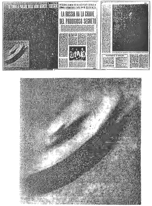Top picture is of a September 6, 1952 article in the Italian newspaper "Tempo". This article deals with the work of Dr. Miethe and features a photograph of his saucerallegedly dated April 17, 1944, taken over the Baltic. Bottom is an enlargement of the photograph. It seems to be a Miethe-Belluzzo type 1 but could also be a type 3. Courtesy of Klaus-Peter Rothkugel. As stated earlier, both projects were under the same authority. Experts and advisors included, according to Epp, among others, head-designer Kalkert of the Gotha Waggonfabrik, head-designer Guenther of Heinkel, engineer Wulf of Arado, engineer Otto Lange of the RLM, and engineer Alexander Lippish of Messerschmitt. Pilots were Holm, Irmler, Kaiser and Lange. The test pilot was Rudolf Schriever. There does exist two alleged still pictures of the Miethe craft in flight. One is reproduced here. It may be the first design.A picture claiming to be of what is called here the third design can be found in W. Mattern's book, UFO's Unbekanntes Flugobiekt?Letzte Geheimwaffe Des Dritten Reiches? (23). Efforts have been made to acquire the picture for this book but the inquiry went unanswered by the book's publisher. Politically, in 1944, Heinrich Himmler, head of the SS, replaced Albert Speer's appointee, Georg Klein, with Dr. Hans Kammler as overseer of this combined saucer project (24). This is a little confusing, however, since Kammler retained Klein as his employee,Perhaps a more practical way to look at this is that Kammler, Himmler's employee, replaced Speer while Klein did what he always did. The result was that the SS took direct and absolute control over these projects from this point until the end of the war. Prior to this happening, news of these designs or application itself was made to the German Patent Office. All German wartime patents were carried off as booty by the Allies. This amounted to truckloads of information. Fortunately, Rudolf Lusar, an engineer who worked in the German Patent Office during this time period, wrote a book in the 1950s listing and describing some ofthe more interesting patents and processes based upon his memory of them (25). They are surprisingly detailed. Included is the Schriever saucer design with detail. Also discussed is the Miethe project. The significance of these two teams can not be minimized in the history of flying saucers or UFOs. Already in this brief discussion, the evidence, taken as a whole, is overwhelming.Please compare this to any and all extraterrestrial explanations of flying saucers. Here we have Germans who claim to have invented the idea of the flying saucer. We have Germans who claim to have designed flying saucers. We have Germans who claim to have built flying saucers. We have Germans who claim to have flown flying saucers. We have Germans who claim to be witnesses to flying saucers known beforehand to be of German construction. We have German construction details. And finally, we have a man who took pictures of a known German flying saucer in flight. The facts speak for themselves. During the Second World War the Germans built devices we would all call today "flying saucers". No other UFO explanation can even approach this in terms of level of proof. Miethe-Belluzzo Saucer In America?