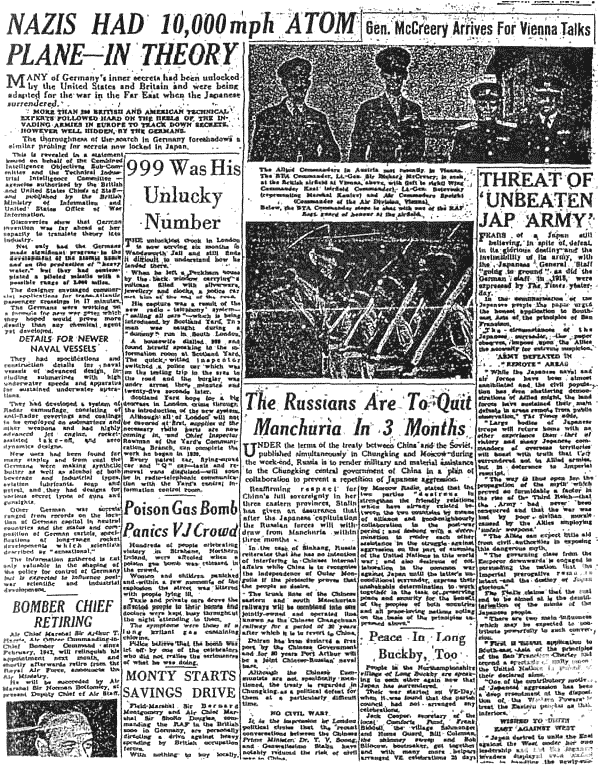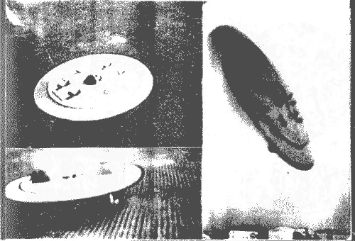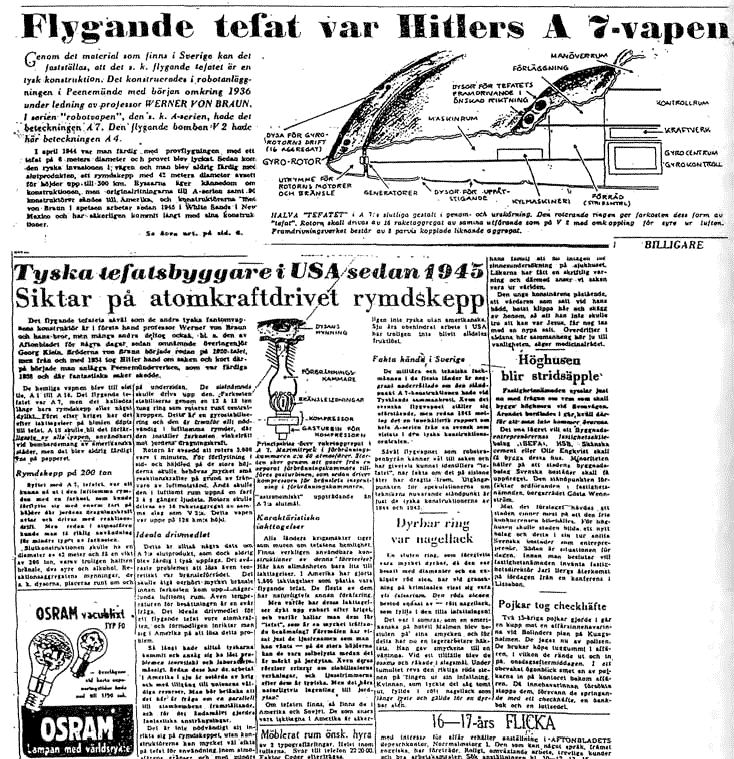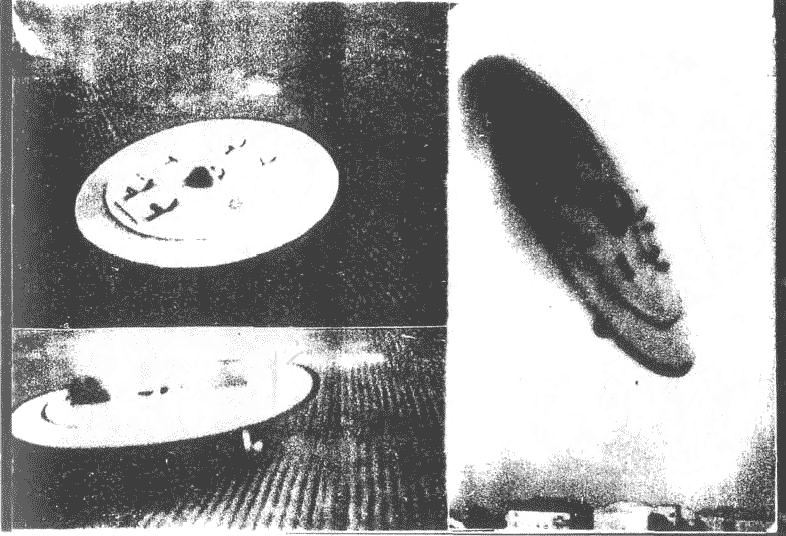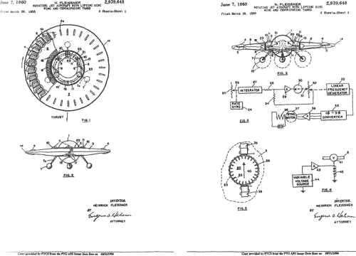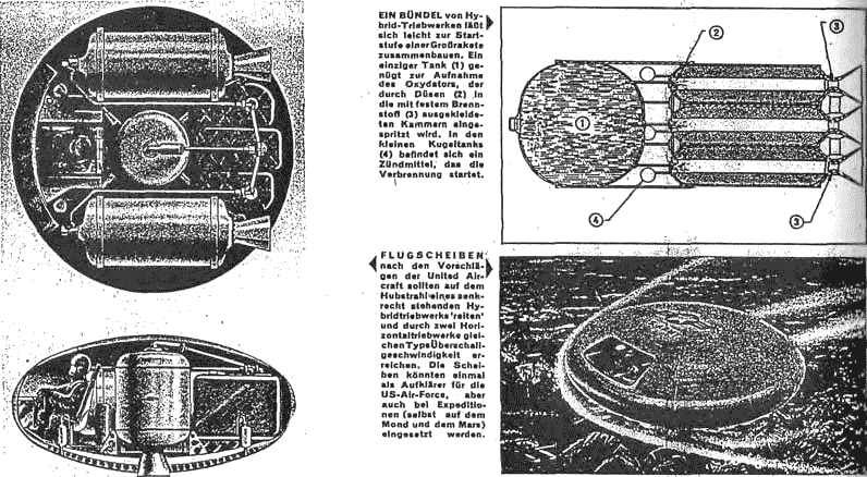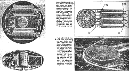Swedish newspaper "Aftonbladet", dated 10/10/52, describes a German saucer built by Wernher von Braun at Peenemuende,six meters in diameter, which lifted off in April, 1944. The article states that high fuel consumption was the major problem, a problem which would be solved utilizing atomic power. The construction drawings for this device are in the USA,according to the article, and the drawings are also known to the Russians. The chief difficulty with the saucer, according to the report, is the tremendous fuel requirements during its assent.This problem, it goes on to say, could be solved through the utilization of atomic energy. Let us look at the picture of the three saucers again. In the lower left picture two dark objects can be seen resting on it stop. Mr. Rothkugel suggests these may be bombs or fuel. Let us assume the latter, that they are fuel drums for refueling the saucer. In the USA metal drums of this type commonly contain petroleum products. They measure about three feet in height.Two are shown but six lengths could be stretched across this saucer with perhaps inches to spare. A meter is slightly over a yard. This saucer roughly corresponds in size to the description given in the Aftonbladet article. The picture on the right,minus the fuel drums and poised above some buildings, clearly shows that this saucer actually flew. A whole technical history and organizational hierarchy can be pieced together from this picture, the Fliessner patent, and the Aftonbladet article. The Fleissner design minimizes the effects of boundary layer resistance reflecting the outcome of work starting with Ludwig Prandtl. It is a circular aircraft and a linear descendant of the circular aircraft designed by Dr.Prandtl and Dr. Alexander Lippisch. Fleissner states that he worked at Peenemuende. Peenemuende functioned as the head of all German saucer research. A fact of life at Peenemuende was that all German scientists deferred to Dr. Wernher von Braun who was an expert, the only expert, at everything. Dr. von Braun did have an organizational supervisor, Dr. Walter Dornberger, later to work for Bell Aircraft in the USA. Above Dr. Dornberger was Dr. Hans Kammler, the SS chief of all jet aircraft and vengeance weaponry. All these named men and organizations were part of the German saucer program, their public denials not withstanding. One more loose end is tied up relating to the Fleissner design.This is the relationship of Dr. Giuseppe Belluzzo to the German saucer projects as a whole. Remember, Dr. Belluzzo was a senior scientist and engineer who specialized in materials and steam turbines. The Fleissner saucer design is normally thought of as a sort of ram-jet. But this ram-jet spun due to thrust imparted to it by its exhaust. This exhaust-supplied motion scooped in and compressed the incoming air before ignition. Low speed flight would have been impossible without this feature just as it is with any ram-jet. So another way to look at this engine is that it was a turbine-ram-jet no matter how incongruous this may sound at first. It should also be noted that in the rocket mode,when the saucer is burning only liquid oxygen and liquid hydrogen, the products of this combustion are only heat and water. Another way to say heat and water is steam. To repeat,Dr. Giuseppe Belluzzo was a steam-turbine expert. As mentioned earlier, Mr. Rothkugel reports that Dr. Belluzzo visited and, presumably consulted with. Dr. Alexander Lippisch at Augsberg.Dr. Belluzzo's involvement with the German saucer projects should not be assumed to be confined to the Miethe project. Let's review the Peenemuende Project to this point. It is a wide ranging project with at least two spin-offs, the Schriever-Habermohl project and the Miethe project. The Schriever-Habermohl project(s) employ a whirling set of vane-blades and one or more rocket or jet engines in a kind of "spinning top" manner.It may have been capable of supersonic flight. The Mietheproject differs in that it employs an internal spinning turbo-jet first invented by Rene Leduc. Depending of the saucer configuration, its thrust can be vented in any direction for steering purposes. It also may have been capable of supersonic flight. This design was given further study and was probably developed after the war in the form of the John Frost "Manta". A design such as this may have been responsible for the sightings by Kenneth Arnold near Mt. Rainier in the State of Washington in June of 1947. It was probably responsible for the pictures taken by William Rhodes as seen and described in the July 9, 1947 edition of the newspaper, The Arizona Republic. This same design, described as a "Flying Shoe" may have figured in the Roswell crash. Ideas from this design may have been further developed by A.V. Roe, Limited company in Canada. Besides retaining overall control of these two saucer projects, the officials at Peenemuende retained and developed their own saucer project. Using similarities between surviving pictures from the time and the patent filed by a former member of that project, Heinrich Fleissner, we can piece together something of its design. Its identifying characteristic is its engine which has been described earlier as a turbine-ram-jet. It could operate using a variety of fuels. It could function as a jet engine within the atmosphere or covert to a rocket engine using liquid oxygen and liquid hydrogen. Its speed and altitude limits would have been much greater than either the Schriever-Habermohl or the Miethe saucers, yet its construction would have been less complex than the advanced designs of the radial-jet engines being developed in the Canada as part of the Silver Bug Program.Recognition of these facts, especially after the 1955 patent application by Fleissner, probably lead to the abandonment of the A.V. Roe, Limited project(s). A cover project, the "Avro car" was released to the public, discredited by its own designers, and put away to be forgotten. In discussing