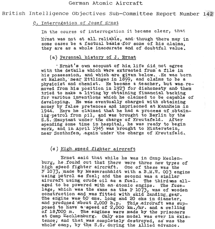 Top: British efforts to accredit and discredit their informant, Josef Ernst. This theme appears repeatedly in Allied documents in association with German informants. The intelligence people were merely covering themselves for all eventualities. Bottom: A German atomic airplane built at Mecklenburg. The Mecklenburg facility utilized some personnel which were considered to be a security risk. One establishment historian, Thomas Powers (29), perhaps unwittingly gives us some insight into the discussion at hand,Powers concentrates on the historical sequence of the German atomic program and with the people involved and their relationships with one another. He also follows the progress ofthe many organizations researching atomic physics for the purposes of energy production and bomb making. Powers documents six such groups. One group concerns this discussion. It was run by the Heereswaffenamt or Army Weapons Department. Its Director of Research was Dr. Erich Schumann who was also the scientific advisor to Field Marshal Wilhelm Keitel. Schumann was a professor of military physics at the University of Berlin. He also held a commission in the army so with these credentials he was able to move comfortably in both academic and military circles. Schumann should be thought of as an administrator rather than a research scientist (30). The field of research was left to Dr. Kurt Diebner (31). Diebner was a physicist for the Heereswaffenamt since 1934 and headed his own atomic research project. German physics during the war years was geared towards practical results. During the early phases of the war it was thought that nuclear weapons were unnecessary. The thinking at the time was that the war could be won without anatomic bomb using conventional weaponry. Therefore, work on atomic weapons was de-emphasized in the early years of the war.Work on atomic means of energy production was always a high priority, a priority which only got higher as the war drug to a conclusion. Germany always felt more threatened by dependence upon foreign sources for energy. Therefore, harnessing the energy potential of the atom for an ongoing source of energy was always a concern for German atomic scientists, much more so than for the Americans. This aim is clearly mentioned in discussion among the scientists involved in the work. In early 1942 the success of Diebner's reactor experiments lead him to propose a full-scale effort to develop both power- producing machines and atomic bombs. He continued to pressure Schumann who was more pessimistic about the possibilities of bringing this research to a practical result. Schumann finally became convinced and agreed to give a presentation to top Nazi officials of their findings. The text of Schumann's speech was to stress the more conservative energy production aspect of atomic research rather than the building of a bomb. This was considered more feasible and so gives us an insight into the German atomic program and its thinking (32). One example of their optimism was the participation of Diebner in plans for building an atomic power plant for Germany's submarine fleet. The year 1945 was mentioned as a target date for this to happen (33)(34). Diebner's relationship to Schumann is made clear by Powers.Powers also introduces us to two additional players who were not officially involved with this project but who somehow interject themselves into things making their view heard. The first is industrial physicist, Carl Ramsauer. Ramsauer was the head of the German Physical Society and a leading researcher for the electrical firm Allgemeine Elektrizitaetsgesellschaft.Ramsauer urged the German research establishment to rid itself of ethnic physics and get down to the business of using science to win a war (35). A second scientist interjected himself into the fray in support of Ramsauer. This was none other than Ludwig Prandtl whom we have met earlier (36). Prandtl was familiar with the potential of fission's use in the war effort and insisted that the Nazis let scientists do science without reference to ethnic background or politics. Why was German atomic research so important to an a scientist involved in aeronautics? What aims did Prandtl have in common with these other individuals which linked them together?What was the urgency that compelled Ramsauer and Prandtl to intervene in a matter outside their areas of expertise and in opposition to the will of Nazi officials? To answer those questions, let us look at each individual involved and his major area of interest. Professor Erich Schumann's interest was the military application of atomic energy. Dr. Kurt Diebner's interest was the development of atomic energy for nuclear weaponry as well as for a variety of other applications. As an industrialist, Karl Ramsauer's expertise was putting technology into large-scale, practical, production. In this time and place that meant military production. We already know that Professor Ludwig Prandl's interests were round-wing, suction aircraft. The interests of these four could only coincide if we were discussing the military-industrial production of a nuclear powered, round-wing, suction aircraft. In addition, it is now known that Dr. Diebner, more than any other well known German scientist, was at the heart of the German atomic bomb development. It was Dr. Diebner who participated in the development of a German uranium bomb which was being prepared in one of the underground facilities at Jonastal, specifically at a facility "Burg". Not only did Dr. Diebner do this but he did this within a working association with the SS atomic research team mentioned above (37). This SS connection runs back to Prag, the Skoda Works and the Kammler Group who held knowledge and control of every truly innovative weapons system being developed by the Third Reich including those at Peenemuende. As we know,this included the development of flying discs. The association of the facilities in and around Prag, the Kammler Gr