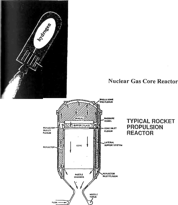 Top: The simple story is that hydrogen is passed through orby an atomic reactor. The very cold liquid hydrogen ininstantly heated and greatly expands, providing thrust for the rocket. No actual combustion occurs and no oxidizer is needed. Bottom: A detailed look at the reactor itself. Wilson cites some evidence that this saucer was built and actually flew (40). Orbiting at an altitude of 300 miles and with a six week mission, this saucer was in reality an orbiting space station capable of raining destruction down upon any country or countries deemed an enemy. One can extrapolate a rotation system by which such a dreadnought was always kept on station for such a contingency. Klaus-Peter Rothkugel has suggested that an orbiting doomsday space station such as this was to be called the "Gatland Space Station" and that it was part of a strategic military joint-effort between the United States,Britain, Canada and perhaps Australia. Before the Popular Mechanics revelation, this assertion might have been dismissed as lacking in proof but now this idea must be given a hearing. Wilson states that project's general contractor was North American Aviation in California but the project was managed out of Wright-Patterson Air Force Base in Ohio where German engineers who worked on rocket plane and flying disc projects were housed under secret contract with the United States government (41). The Popular Mechanics article is based upon information obtained from working on the American perspective and going back in time. The Freedom Of Information Act was very skillfully employed in obtaining this information. What Mr. Wilson did not know was what the reader knows now, that there is a trail of information leading to the American nuclear saucer project which started in Germany in the 1930s. One example which links both lines of evidence and bringing them full-circle back to the German origin is one report recently obtained via FOIA on a particular German scientist working at that Wright-Patterson facility. This is a December, 1946 report written by one of those captured German scientists working under contract for the USA, Dr. Franz J. Neugebauer, titled "Effect Of Power-Plant Weight On Economy Of Flight (Project No. NFE-64). Dr. Neugebauer was, in fact, one of those "booty scientists" brought to the USA under the auspices of Operation Paperclip. The Biographical Note in the report, "Effects Of Power-Plant Weight On the Economy Of Flight", describes Dr. Neugebauer as: "Dr. Franz J. Neugebauer is the foremost German authority on this subject. An Expert on internal-combustion engines and a specialist for Diesel compound aircraft engines, he held leading positions at Junkers in Dessau and Munich from 1924 to 1943, andwas director of the engineering department of the Institute forAeronautical Research at Munich from 1943 to 1945. Dr. Neugebauer is employed at present in the Propulsion Section, Analysis Division, Intelligence (T-2), MAC, Wright field, Dayton, Ohio" (42). Two comments are in order. The first is that Junkers-Dessau is associated with a possible German saucer project designated "Schildkroete" which will be discussed later. The second comment is that Dr. Neugebauer was not brought to the USA to build diesel-powered aircraft. Diesel engines are much heavier than piston type aero-engines of those times. Dr. Neugebauer's relevant expertise is, in reality, his knowledge of the effects of heavy engines on aircraft performance and economy. Nowhere in this report are the words "atomic rocket" mentioned but the implications are clear. As touched upon above, an atomic rocket's weight distribution would be somewhat different from that of a conventional rocket or aircraft. The nuclear reactor would be weighty but the fuel load would be lighter because no oxidizer, such as liquid oxygen, would be necessary. Also, the power output would be somewhat greater than an ordinary liquid fuel chemical rocket. The three variables as opposed to the already known figures for piston, jet or chemical rocket engines are greater engine weight, lesser fuel weight, and greater power output. A new equation was necessary if atomic rockets were to be fitted into an aircraft design calling for a certain speed,payload or range. It was Dr. Neugebauer's job to do this computation. The following is a paragraph from the introduction of this report(43). It seems to say nothing but state the obvious until one thinks "atomic engine":
