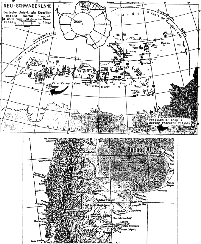Top: Neuschwabenland (Antarctica). Bottom: "Colonia Dignidad" in Argentina near Chilean border comprising 25,000 quadratkilometers (over half as large as Switzerland) The subterranean island base was actually visited by two eyewitnesses, according to the Nugget report. There, two derelict U-boats were discovered which had remained undetected for over thirty years. One of these U-boats was entered by the two adventurers. Inside they found detailed nautical maps of South America. To add to the mystery, the assertion is made that these U-boats and this base functioned with the full knowledge ofthe U.S. government right into the 1950s. This base would have formed a physical link between the ports of Spain and destinations in South America. Perhaps even bridging bases in Greenland with Antarctica, if certain reports are true. It is also fuel for the argument that a technological transfer actually took place between the Third Reich and entities in the Southern Hemisphere. As surely as die-hard Nazis spread into the Southern Hemisphere sightings of flying saucers followed. Further, if the government of the United States knew of this transfer and these U-boat bases then there then there may have been some actual political link or understanding between the government of the United States and the post-war Nazis, the"Third Power". If his words are read carefully, Landig's Point 211, the Antarctic base, can be located on the maps he supplies (21).Until, however, this base is visited and excavated and the evidence made public, this base along with the ones in Canada and Greenland constitute more speculation than fact. This is not true, however, in the South American situation. In the immediate post-war world South America was a haven for Germans who could not stomach Occupied Germany for one reason or another. The political climate in these countries was favorable toward these refugees. Nazi gold and money was transferred to South America, particularly Argentina. Hunted Nazis found a market for their services in a variety of occupations. SS organizations set up shop as they had in Franco's Spain. These facts are hardly in dispute. They are covered in detail by Infield (22) as well as by Farago (23) a whole genre of "Nazi Hunter" writers. What is less often mentioned is that German technical people infused these countries with expertise gained during the Second World War. For instance, Argentina and Brazil had state-of-the- art jet fighters in the 1950s thanks to the efforts of German immigrant scientists and technicians. Along with this monetary and technical transfer, large landholdings were purchased, secured and set aside with the full knowledge of the South American governments in power. From these vast secure areas members of these German organizations simply did as they pleased. It is not out of the question to think that the flying saucers seen in the late 1940s and 1950, both conventional and field propulsion, were built and flown from these bases. One of these Andean bases, referred to as "Colonia Dignidad" consisted a land area half the size of Switzerland(24). This is certainly more than enough room to develop hide anything. The South American industrial base during these times was more than adequate to make these saucers. But even if this were not true, this is no argument against construction of flying saucers in South America. Parts could have been ordered from suppliers in other countries as are done by major aircraft firms today. Each major aircraft firm has a host of sub-contractors who manufacture everything from individual screws to complete sub- assemblies. Many if not most of these sub-contractors are accustomed to filling these orders without ever knowing what the final assembled product will be. This is part of the security system and unquestioned. Germans working in South America would have no trouble using this system. They could have even ordered parts and sub-assemblies from companies in Europe and the USA. This is exactly what Dr. Gerald Bull did in Iraq when he built the largest of his high-pressure cannons for that country. This nearly mile long fixed gun was built resting on the slope of a hill pointed at Tel Aviv. It would have been able to shoot projectiles weighing about 1800 pounds. Parts were built by sub-contractors all over the world and sent to Iraq for assembly where it was nearly completed. The sub-contractors were lied to or otherwise kept in the dark as to the purpose of their components. It was only by chance that word of this project reached the hands of opposing intelligence services. The result was near panic in the intelligence services of these countries.What followed was the assassination of Dr. Gerald Bull and a diplomatic ruse which bated Saddam Hussein into an invasion of Kuwait. This invasion facilitated the entry of the Americans into the conflict. The high pressure cannon was destroyed immediately, even though it was pointed in the opposite direction from Kuwait. If this risky, bulky weapon's system could be almost completed using a system of unwitting sub-contractors world-wide, imagine how easily a one-off flying vehicle could be built using the same system. Richard Ross, a UFO researcher based in Austin, Texas, reports tome that even today vast tracts of land in South America are avoided by airline pilots there because of UFO activity in these areas. He obtained this information by interviewing the South American airline pilots themselves. He goes on to make the point that Latin America is a hotbed of UFO activity. Reports of this activity for some reason never find their way into the mainstream American news media. There still remains one possible hiding place on European soil.There remains the possibility that German flying discs were flown to Switzerland during the last moments of the 3rd Reich and hidden there in the vast system of caves built there for defensive purposes by the Swiss. This would imply a limited partnership with the Swiss