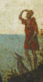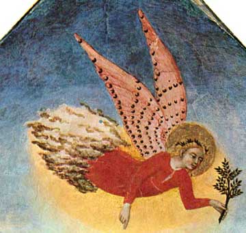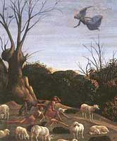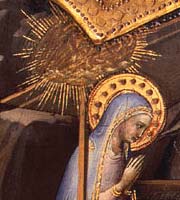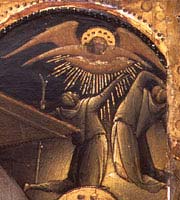 Sano di Pietro, the Angel from "Annunciation to the Shepherds" (mid XV century)We can, then, link the "tondo" with the Madonna and Child with the Infant St. John with the iconographical tradition of that period, the end of the '400 in Florence. The archaic detail of the three stars symbol of the threefold virginity of Mary, and the painting of the Angel not as an anthropomorphic character but as a "cloud of light", make us think of an adhering on the part of the author to the teachings of Girolamo Savonarola, the Domenican monk who preached a return to tradition and purity in the arts as well as in city life.