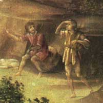 Also another "tondo", attributed to the school of Sebastiano Mainardi and on display at Sommariva Perno, shows the same scene of a shepherd who, with a hand to his forehead and a dog at his side, looks towards the apparition of the red-dressed Angel. And in the center, above the Madonna's head, there is the same light-rayed cloud.