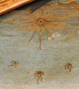 But this is not the only peculiarity of the painting: for example, to the upper left we see the Nativity Star with three other small stars, or perhaps flames. A very similar detail is present in the Madonna of the Book (1480) by Sandro Botticelli