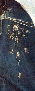 The religious symbology which we find in this Madonna is therefore in line with this older iconography that in the Florence of the humanism and Neo-Platonism had been lost. The three stars, for example, appear often in the paintings of the previous century, and especially in the byzantine icons of the Madonna; often, they were painted on her veil, on the shoulders and forehead; other times they are replaced by three rays; they always represent the "threefold virginity" of the Madonna, i.e., before, during, and after the virgin birth. The three stars, in the same meaning, are also found on the coat of arms of the Oratorian order of Saint Filippo Neri (hence, also called "Filippini"), who are particularly devout to the Madonna.