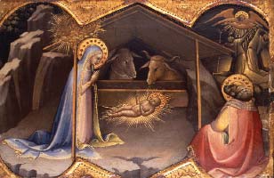 In the Nativity by Lorenzo Monaco (1409), we find the same cloud over the Madonna, while the Angel comes out of a similar cloud to make his announcement to the shepherds.
