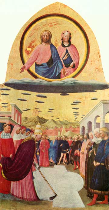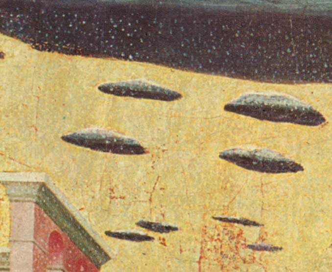 In "The miracle of the snow" by Masolino da Panicale there are no UFOs. The story of was written by Bartolomeo da Trento 1000 years after the presumed miracle (a.D. 352) and it became a very popular legend. Many churches dedicated to the miracle was built and many painters represented the same scene. The stylized clouds are similar to other clouds painted by Masolino, Benozzo Gozzoli and other artists of the first half of XV century.