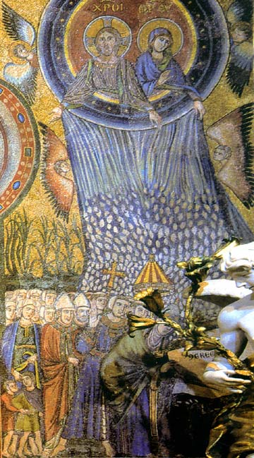 fronte - front retro - backDicevamo degli "oggetti volanti non identificati", che sarebbero quelle strane nubi che si trovano sotto una nube più grande sulla quale sono raffigurati Gesù e la Madonna. Ecco un particolare del dipinto, nel quale si nota la neve che cade dalle nubi: