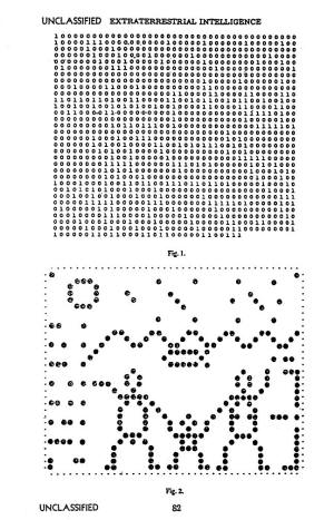 The message, consisting of 1271 binary digits or “bits,” is shown in Fig. 1. Since 1271 has but two prime factors, 31 and 41, we would naturally be led to write out the message in raster form, in 41 lines of 31 bits each, or in 31 lines of 41 bits each; the latter case reveals a greater non-randomness in the patterns disclosed, indicating that these are the correct dimensions. In Fig. 2 is the write-out of the message, in which the binary 1's have been replaced by a dot and the 0’s left as blank spaces.